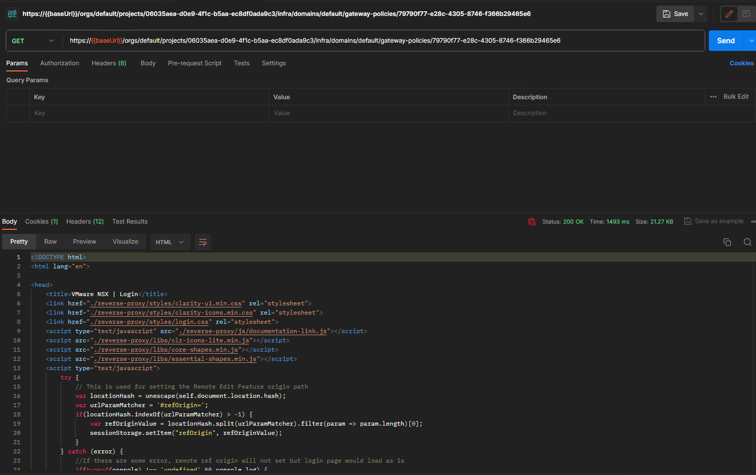 Onwards to the API then! I’m using Postman simply because I don’t know any other API client that is not curl or wget and is a bit more sophisticated. I’ve configured my Postman as Rutger Blom shows in his blog except I didn’t load the OpenAPI specifications so be aware that when you see {{baseURL}} this means the FQDN of my NSX manager. The first request that I did was a GET of that API path https://{{baseUrl}}/orgs/default/projects/06035aea-d0e9-4f1c-b5aa-ec8df0ada9c3/infra/domains/default/gateway-policies/79790f77-e28c-4305-8746-f366b29465e6, this will have a strange result since the output will have the title VMware NSX | Login.