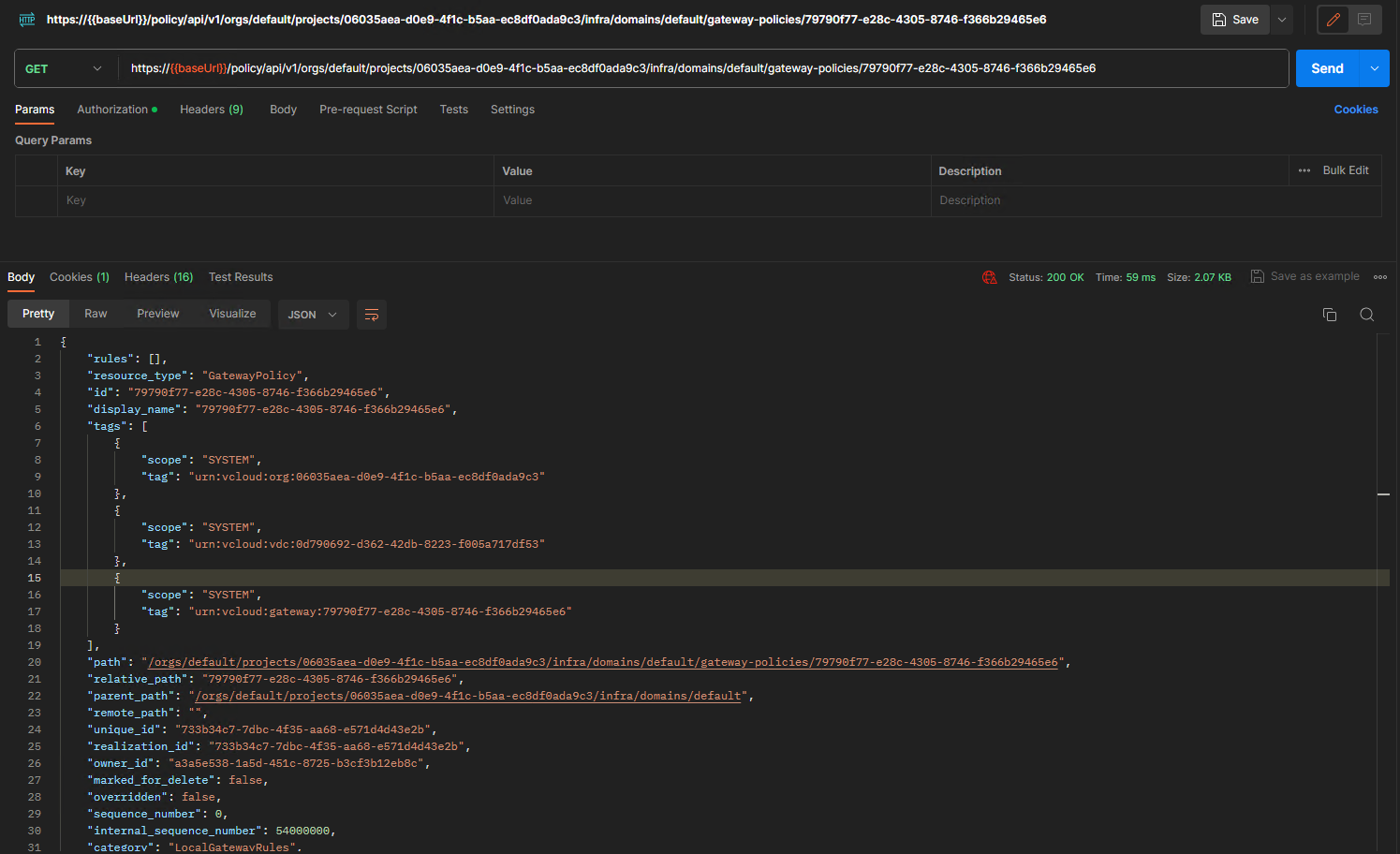 I’ve then dug a bit deeper and found that the error is not the full path of the request it’s doing you will need to add https://{{baseUrl}}/policy/api/v1/ as a prefix yourself. So a second attempt with the following API call GET https://{{baseURL}}/policy/api/v1/orgs/default/projects/06035aea-d0e9-4f1c-b5aa-ec8df0ada9c3/infra/domains/default/gateway-policies/79790f77-e28c-4305-8746-f366b29465e6