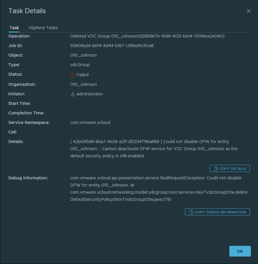 I’ve also tested deleting an Org VDC that doesn’t use NSX Tenancy and this works perfectly every single time, so the impact is only related to Organizations and Org VDC that have NSX Tenancy enabled.