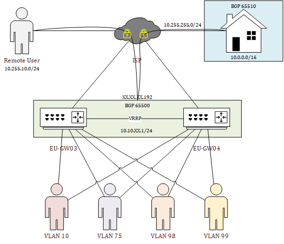 When I’m at home, I have a Ubiquiti USG router that has a permanent Site-to-Site IPSEC VPN connection to link the VyOS router and the USG with each other. This allows communication from the lab to my home and the other way around. Again, this is handy for management and is always nice for when I’m playing around with stuff like home automation. My home network is therefore an extension of the lab network that I have in the datacentre.